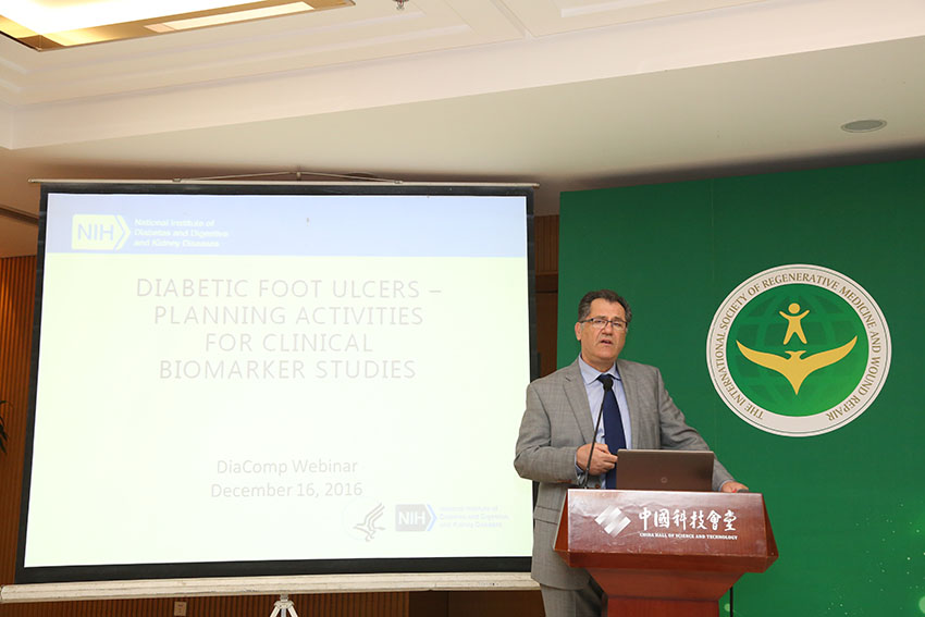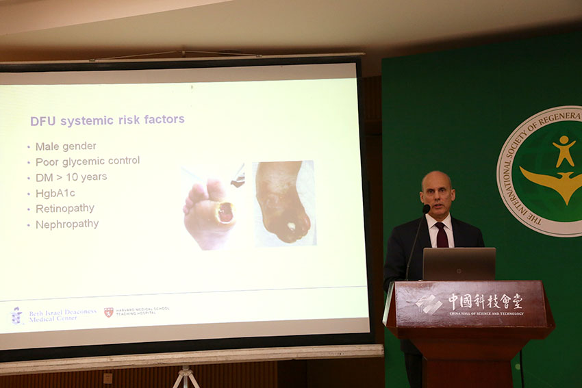 來(lái)自各醫(yī)學(xué)專家教授圍繞再生醫(yī)學(xué)與創(chuàng)面修復(fù)分別發(fā)表了重要學(xué)術(shù)演講。哈佛醫(yī)學(xué)院外科副教授、BIDMC足病科主任約翰·吉里尼博士在大會(huì)上向現(xiàn)場(chǎng)來(lái)賓陳述了糖尿病潰瘍發(fā)病過(guò)程及如何治療,重點(diǎn)剖析了足部潰瘍的原因并從病理學(xué)和微生物學(xué)檢查等方面講解了應(yīng)對(duì)及預(yù)防的措施和治療效果,從而降低截肢率。