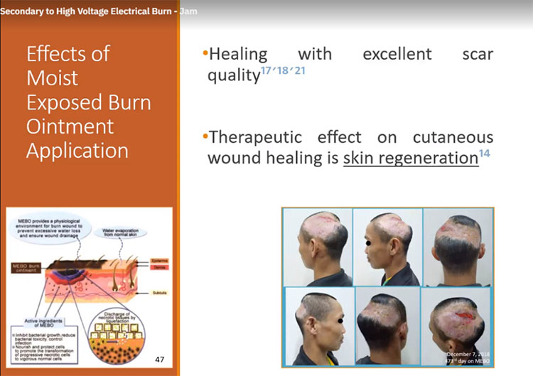 在口頭演講版塊,共有3名醫(yī)生帶來(lái)了針對(duì)濕潤(rùn)燒傷膏的臨床應(yīng)用經(jīng)驗(yàn)分享。首先,來(lái)自菲律賓達(dá)沃醫(yī)學(xué)中心的James Paul Dumdum醫(yī)生帶來(lái)了題為《濕潤(rùn)燒傷膏用于治療高壓電燒傷導(dǎo)致的頭皮缺損》(Use of Moist Exposed Burn Ointment on a Scalp Defect Secondary to High Voltage Electrical Burn)的演講,他分享的是一例全層頭皮缺損患者應(yīng)用濕潤(rùn)燒傷膏治療的完整過(guò)程。