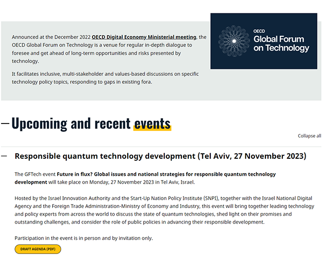 本次經(jīng)合組織全球技術(shù)論壇由以色列創(chuàng)新局和創(chuàng)業(yè)國(guó)家政策研究所(SNPI)、以色列國(guó)家數(shù)字機(jī)構(gòu)和以色列對(duì)外貿(mào)易管理局-經(jīng)濟(jì)和工業(yè)部共同主辦,將匯集領(lǐng)先的技術(shù)和政策專(zhuān)家,討論量子技術(shù)的現(xiàn)狀,突出其前景和問(wèn)題,并考慮公共政策在促進(jìn)其發(fā)展方面的重要作用。以色列、美國(guó)、丹麥、英國(guó)、奧地利、印度、日本、加拿大、巴塞羅那等國(guó)家和地區(qū)的科技部負(fù)責(zé)人、具有開(kāi)創(chuàng)性的技術(shù)專(zhuān)家、國(guó)家政策研究中心或國(guó)家科學(xué)研究中心責(zé)任人、重要技術(shù)企業(yè)的CEO等將出席此次大會(huì)。