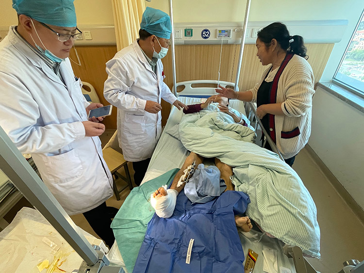 為推動(dòng)黨史學(xué)習(xí)教育走深走實(shí),扎實(shí)開展"我為群眾辦實(shí)事"實(shí)踐活動(dòng),2024年10月25日下午,湖北宜昌“枝江市人民醫(yī)院臨床外科黨支部燒傷慢創(chuàng)防治先鋒隊(duì)”,“枝江市人民醫(yī)院天使志愿服務(wù)隊(duì)”李翔主任,余春子護(hù)士長(zhǎng)和徐榮祥再生生命公益基金志愿者杜繼同志等,到訪問安鎮(zhèn)和仙女鎮(zhèn)高峰橋村,開展護(hù)理延伸服務(wù)入戶服務(wù)活動(dòng)。李主任和護(hù)士長(zhǎng)及管床醫(yī)師一直心系高齡患者恢復(fù)情況,看到患者創(chuàng)面無感染,基本愈合,倍感安慰,護(hù)士長(zhǎng)還給予居家照護(hù)和健康指導(dǎo)等,老人收到生活慰問品和慰問指導(dǎo)時(shí)深表感謝!院外延伸服務(wù)是醫(yī)院提高醫(yī)療質(zhì)量、提升服務(wù)品質(zhì)、改善醫(yī)患關(guān)系的重要手段。護(hù)理延續(xù),讓關(guān)愛延伸!