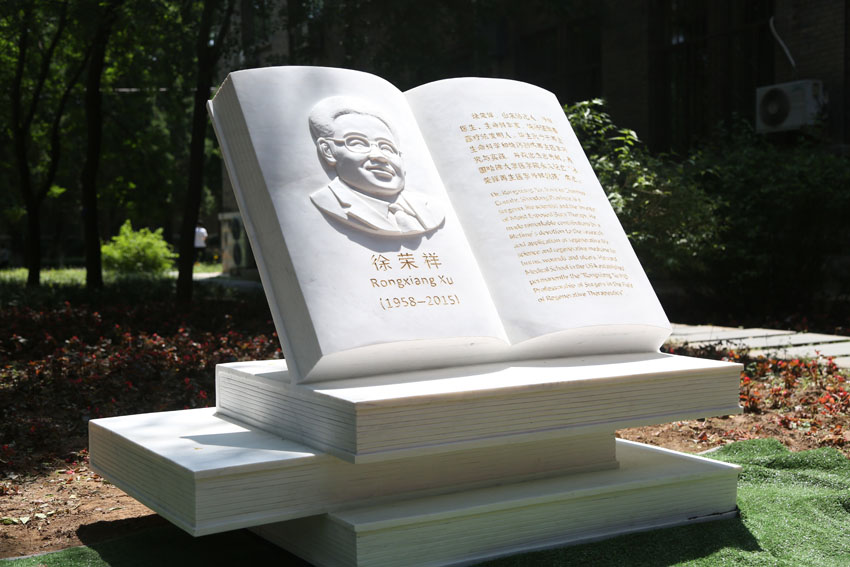 “榮祥樓”牌匾由中國傳統(tǒng)工藝景泰藍(lán)精制而成,徐榮祥教授紀(jì)念刻石則由通體漢白玉雕刻而成,碑書內(nèi)容中英文金字鑲刻,高度概括了徐榮祥教授的一生:徐榮祥,山東沾化人,外科醫(yī)生、生命科學(xué)家,燒傷濕潤暴露療法發(fā)明人。畢生致力于再生生命科學(xué)和燒傷創(chuàng)瘍再生醫(yī)學(xué)研究與實踐,并做出杰出貢獻(xiàn)。美國哈佛大學(xué)醫(yī)學(xué)院永久設(shè)立“徐榮祥再生醫(yī)學(xué)外科教授”席位。